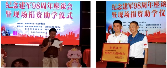 共话强军梦 情系学子心发表时间:2025-08-02 09:12 共话强军梦 情系学子心 (本网益阳/任爱华/徐铁人/供稿)在七月炽热的阳光里,益阳市涌动着一股温暖而激昂的力量。7月 30 日上午,一场意义非凡的纪念建军 98 周年座谈会暨现场捐资助学仪式在湖南省益阳市顺利举行。此次活动由益阳市关心下一代工作委员会悉心指导,益阳毛泽东战法研究会、益阳市扶贫助学促进会、益阳市健康协会、赫山区禁毒协会携手联合主办,在社会各界引发了广泛关注。